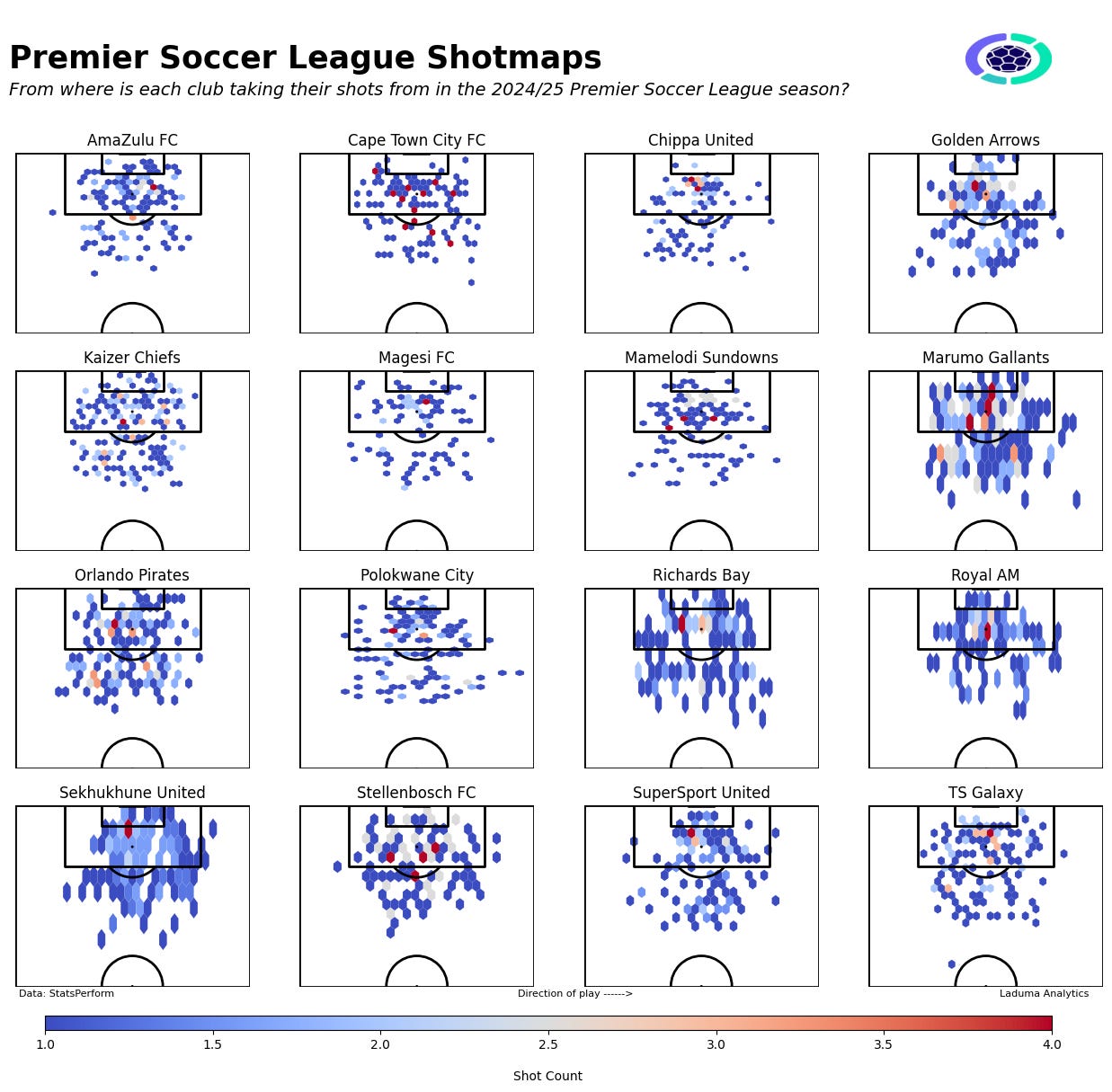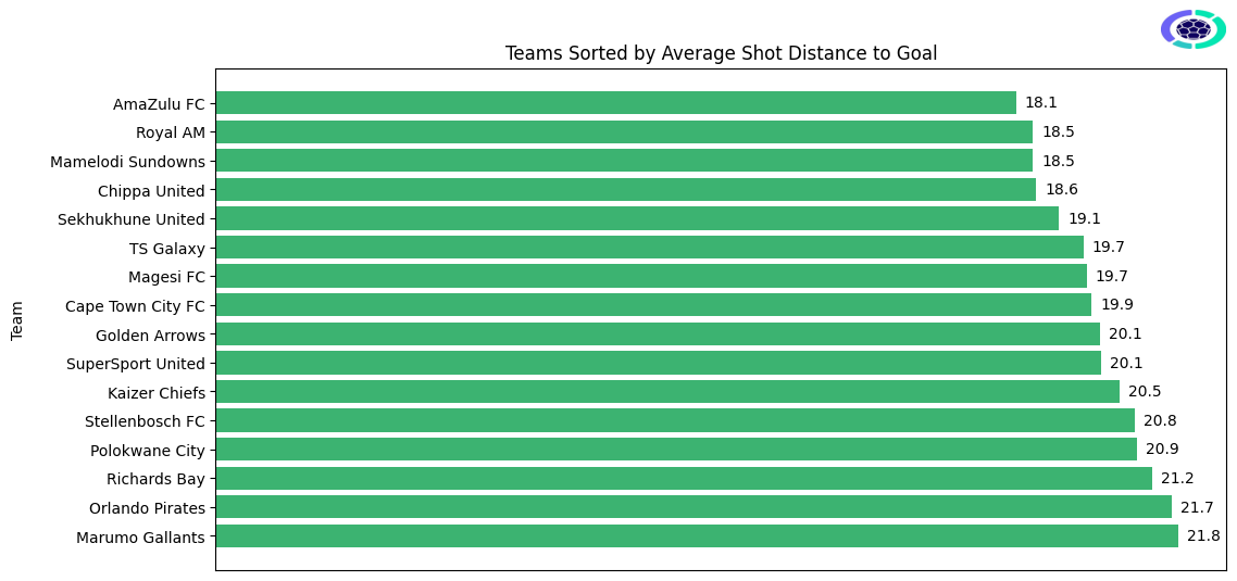 Alternatively, if you zoom out and examine the average distance of shots, you’ll notice an interesting contrast: the top-scoring teams, Sundowns (ranked 3rd closest) and Orlando Pirates (ranked 3rd furthest), occupy opposite ends of the spectrum. Pirates have been particularly running hot with long-range shots, having scored eight goals from distance—more than any other team and more than they scored last season.