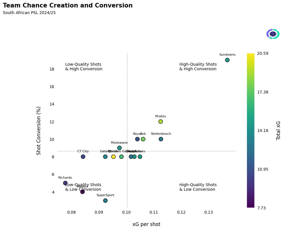 Sundowns may not aim too often, but a good proportion of their few shots seems to be carefully chosen. We can’t talk about the 24% shot conversion without mentioning the parallel - that 24% of their shots are in the moderate to high-quality range. Converting 1 in 4 shots is a ridiculously high number, but in prioritizing high-quality shots, not many are wasted. When your shot quality and shot distance numbers are good, volume becomes less important. The xG conversion scatter plot below shows just how clinical Sundowns have been, taking the highest-quality shots at the highest conversion (excluding blocks).